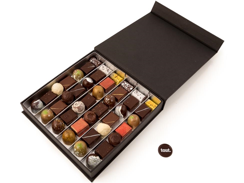Een luxe zwarte klepdoos met magneetsluiting met een assortiment van 42 bonbons, waarbij wij diverse smaken voor u sorteren uit ons gehele assortiment.