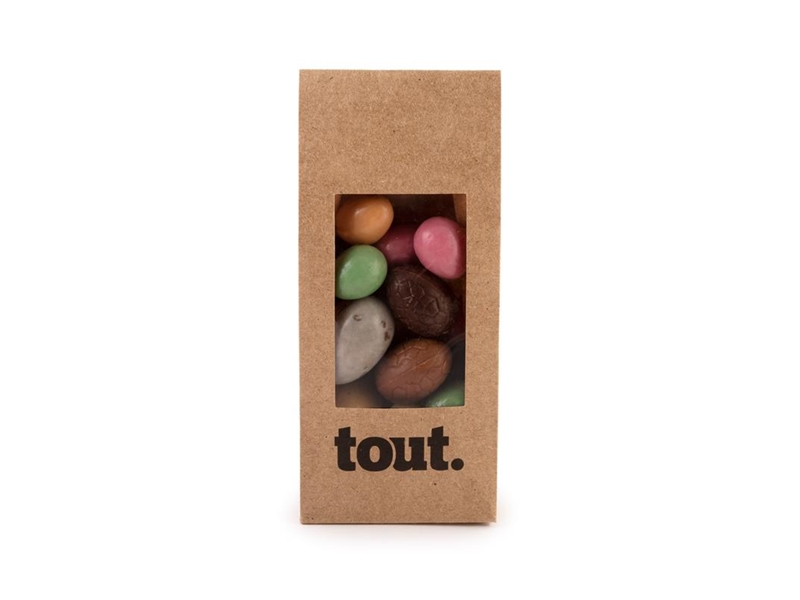 Een zakje met een assortiment van 150 gram van al onze eitjes; massief, praliné, feuilletine en kievits eitjes.