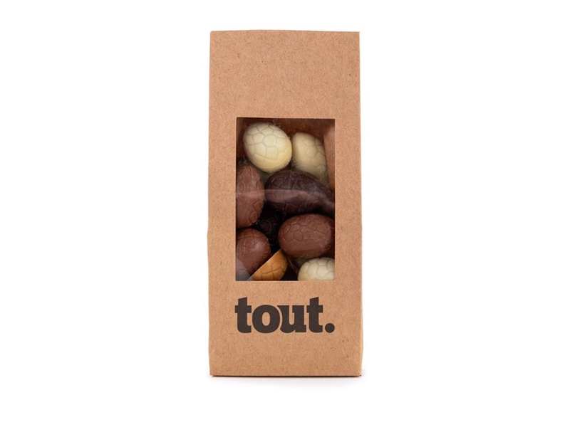 Praliné eitjes, gemaakt van Valrhona chocolade in melk, wit, puur,- en dulce chocolade gevuld met heerlijke amandel-hazelnoot praline.