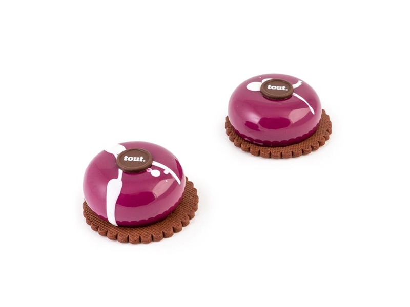 Een brownie zonder noot, karamel van framboos met verse framboos, een mousse van Manjari chocolade uit Madagaskar en pure chocoladebiscuit.