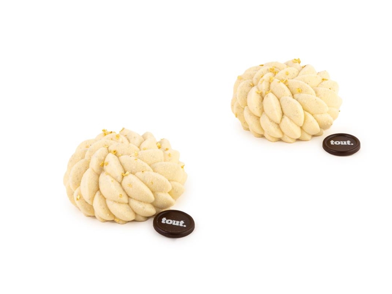Een gebakje gebaseerd op een Saint Honoré. Een mousse van vanille, een soesje gevuld met gerookte praliné en een namalaka van karamel met op de bodem een krokante pâte sable.
